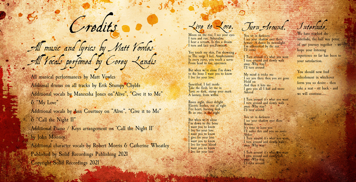Prince of Darkness on Blood Red Translucent Vinyl. The original concept of this album was to be played as vinyl disc - a physical tactile experience - to come with us on a journey from the Introduction through Side A to the Interlude - and to flip over to Side B. To read and sing along to the lyrics printed on the inner sleeve.